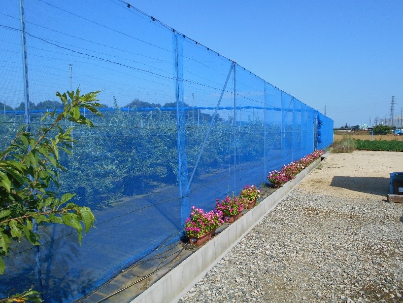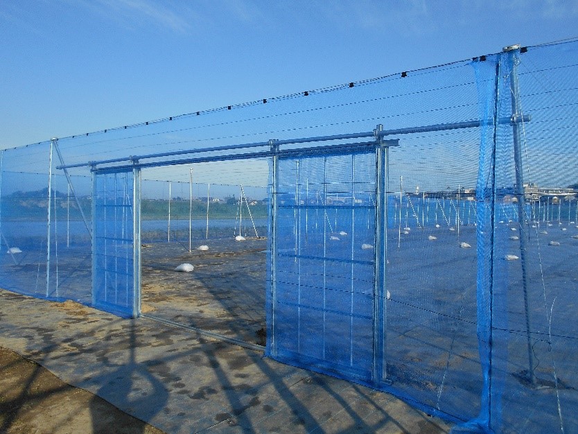 県内ブルーベリー園様での施工です。1mm目の細かいネットを使用し、防風と防鳥を兼ね備えた棚です。