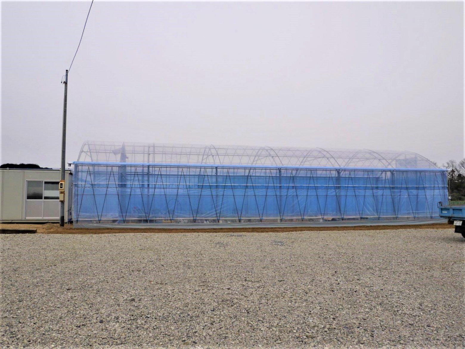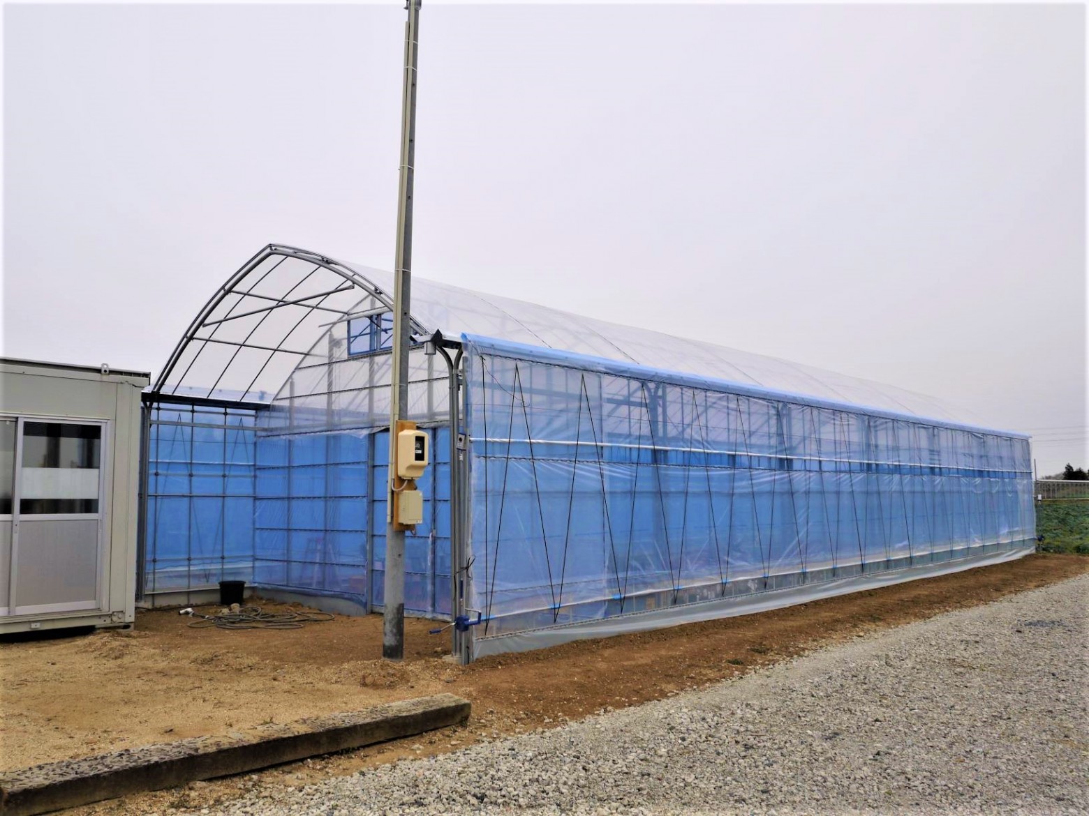 長さ18m間口6mの3Pハウスの施工をさせていただきました。施主様の希望により、妻面(入り口扉)を1.5m程中に入れて、入口の前部分に雨よけスペースを作りました。