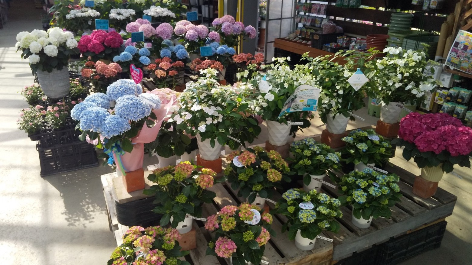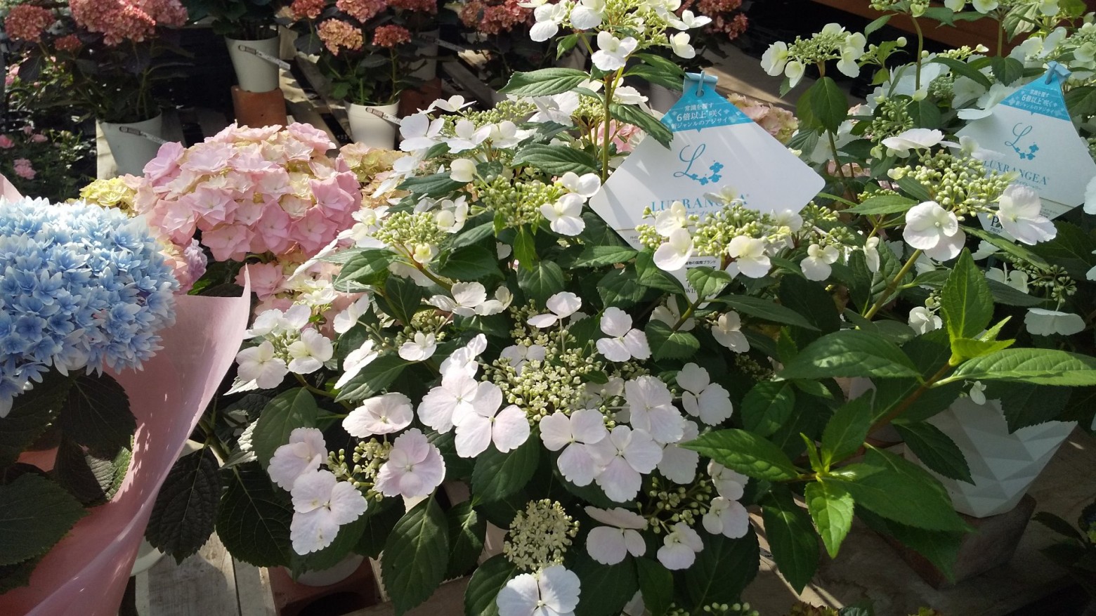 最新の品種からとてもキレイな花色の紫陽花を大量入荷して、店頭を彩っております。