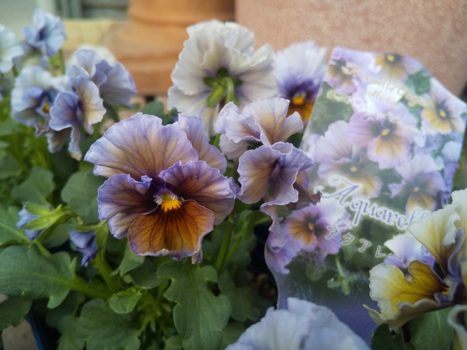 フリル咲きのビオラで、パステル系の色彩が特徴的です。