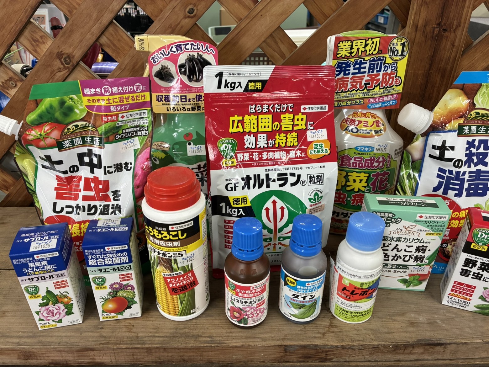 初心者の方には、すぐに散布できる「スプレー剤」や土にまくだけの「粒剤」「ペレット剤」が便利です。