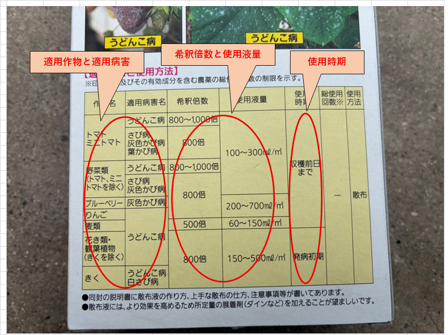 ラベルには、使用できる植物名、効果のある病害虫名とともに、使用方法(希釈倍数、使用時期、使用回数など)、使用上の注意点が詳細に書かれています。