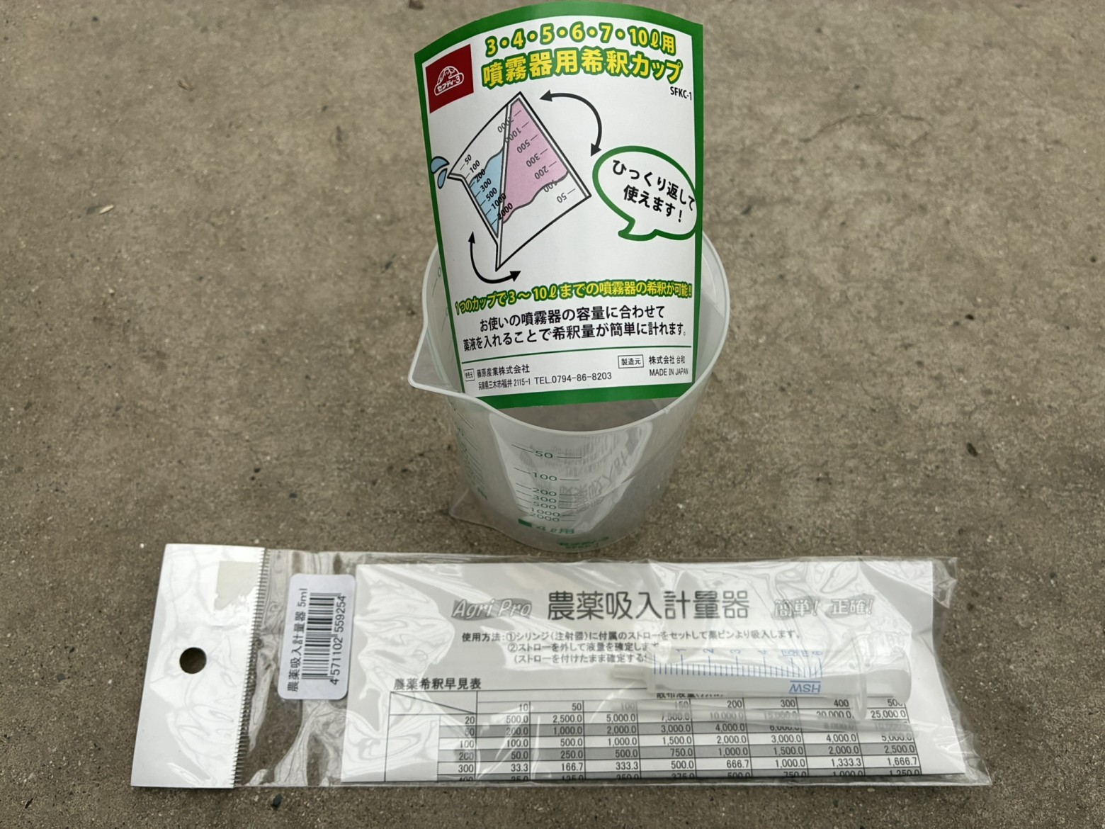 計量しやすいように、当店では「希釈カップ」や「農薬計量器」の販売もしております。(写真③見てください)