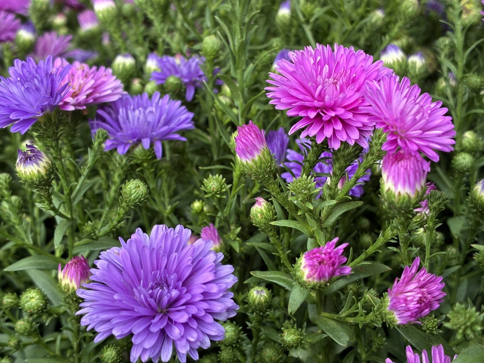 暑さ、寒さにも強く花もちがよい完全八重咲きのアスター「ビクトリア」の2色植え鉢!