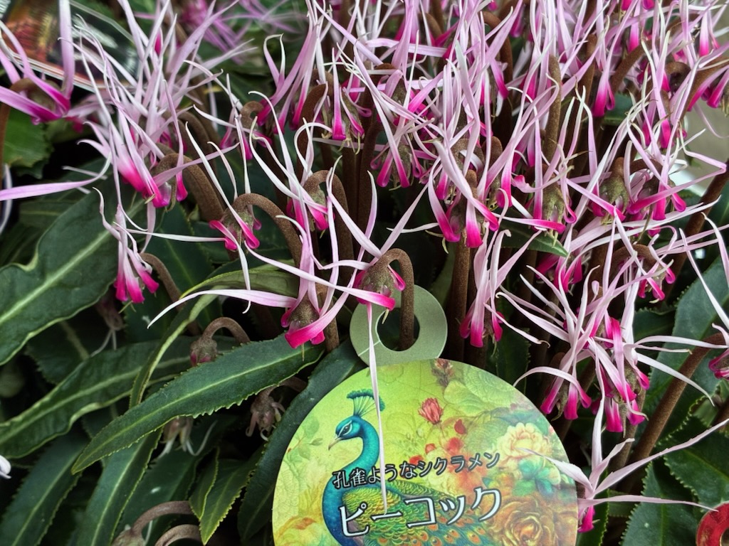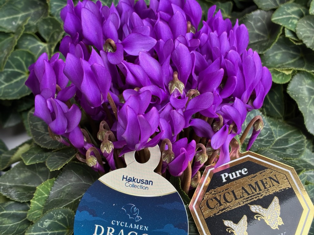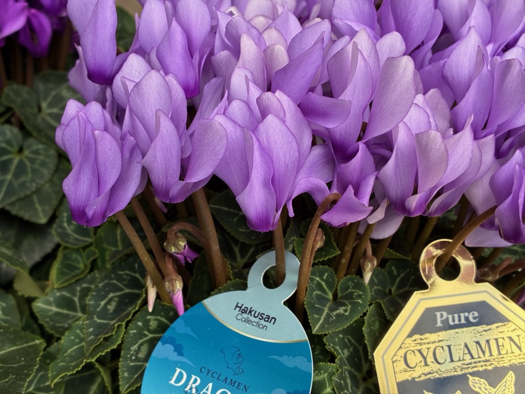 「ドラゴン」「ピーコック」ともに匠の生産者、福岡県 坂本植物園さんのシクラメン鉢花です。