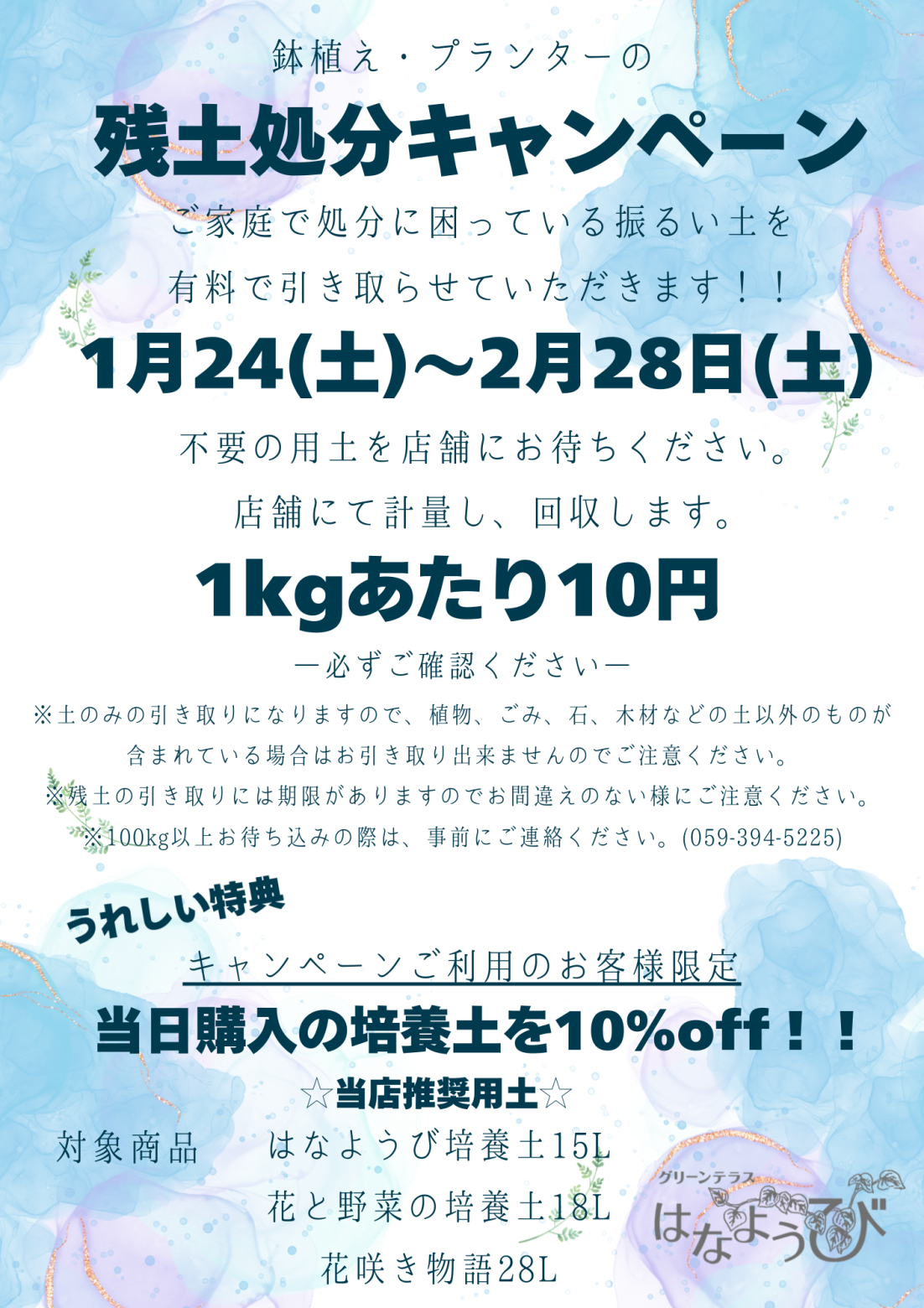 キャンペーンご利用当日購入の培養土を10%offいたします。(在庫限り)